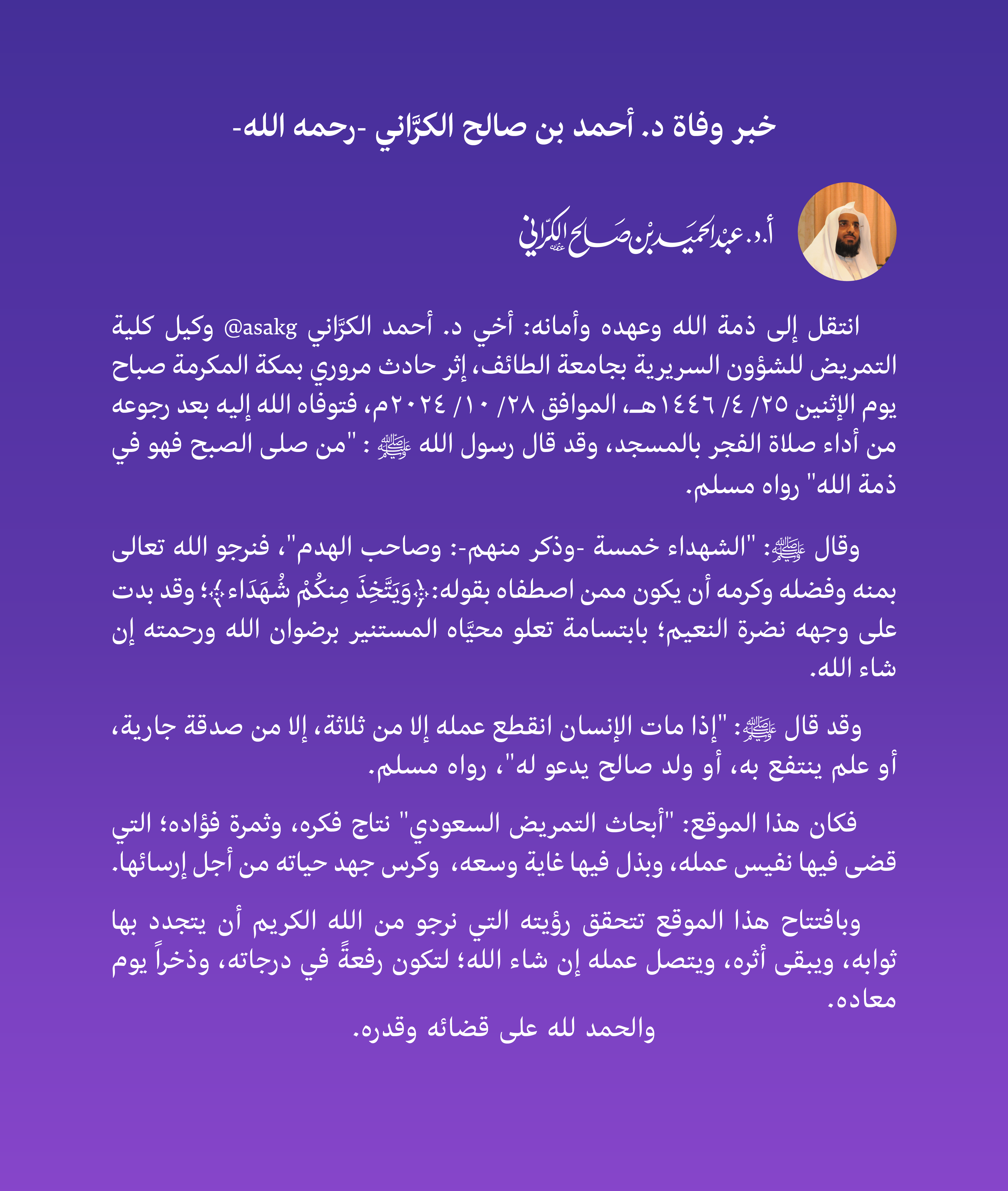 خبر وفاة د. أحمد الكراني -رحمه الله-